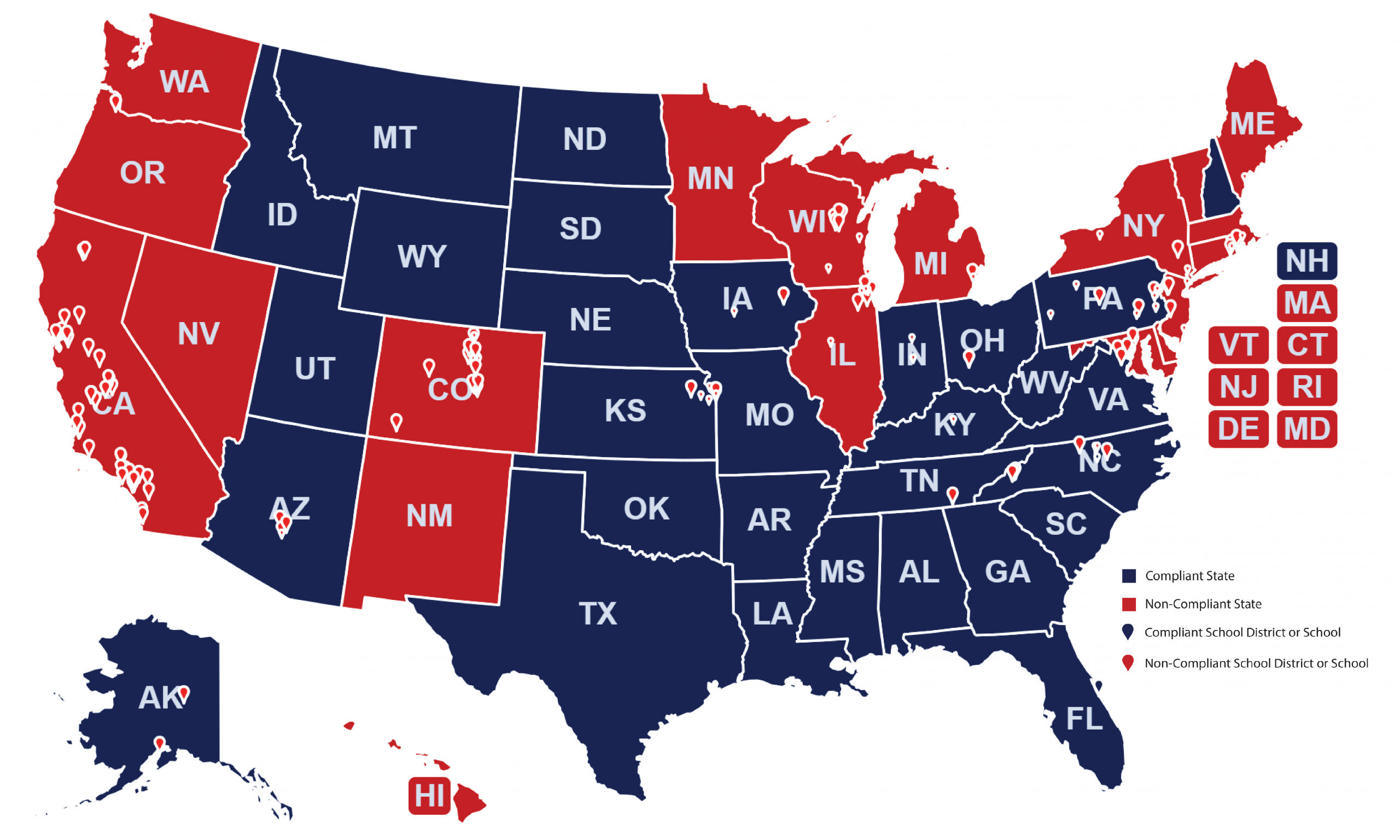 We have created a Heat Map as a visual reflection of our efforts to date. The red coloring represents areas where members have identified current discriminatory practices, and the blue areas reflect those for which no discrimination has yet been documented. The markers on the map reflect school districts and the small markers represent schools.